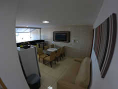 - Sala de jantar com TV e mesa acoplada ao ambiente da cozinha.